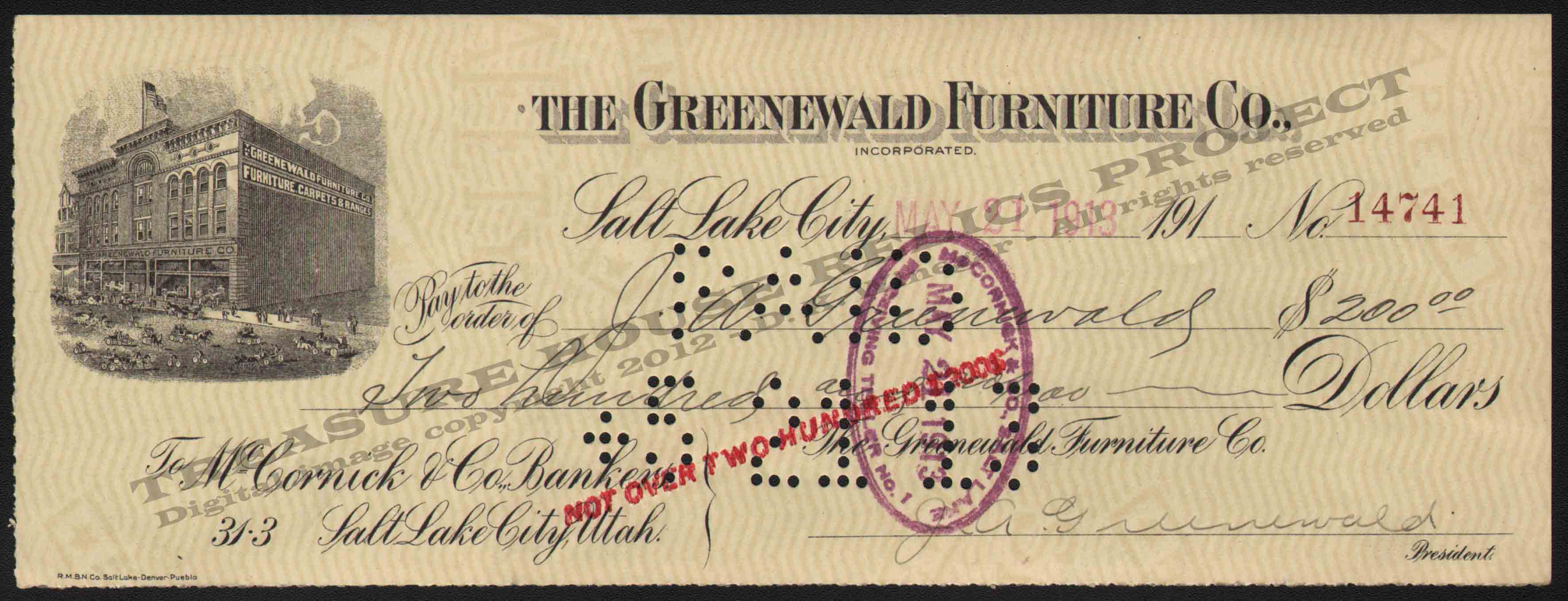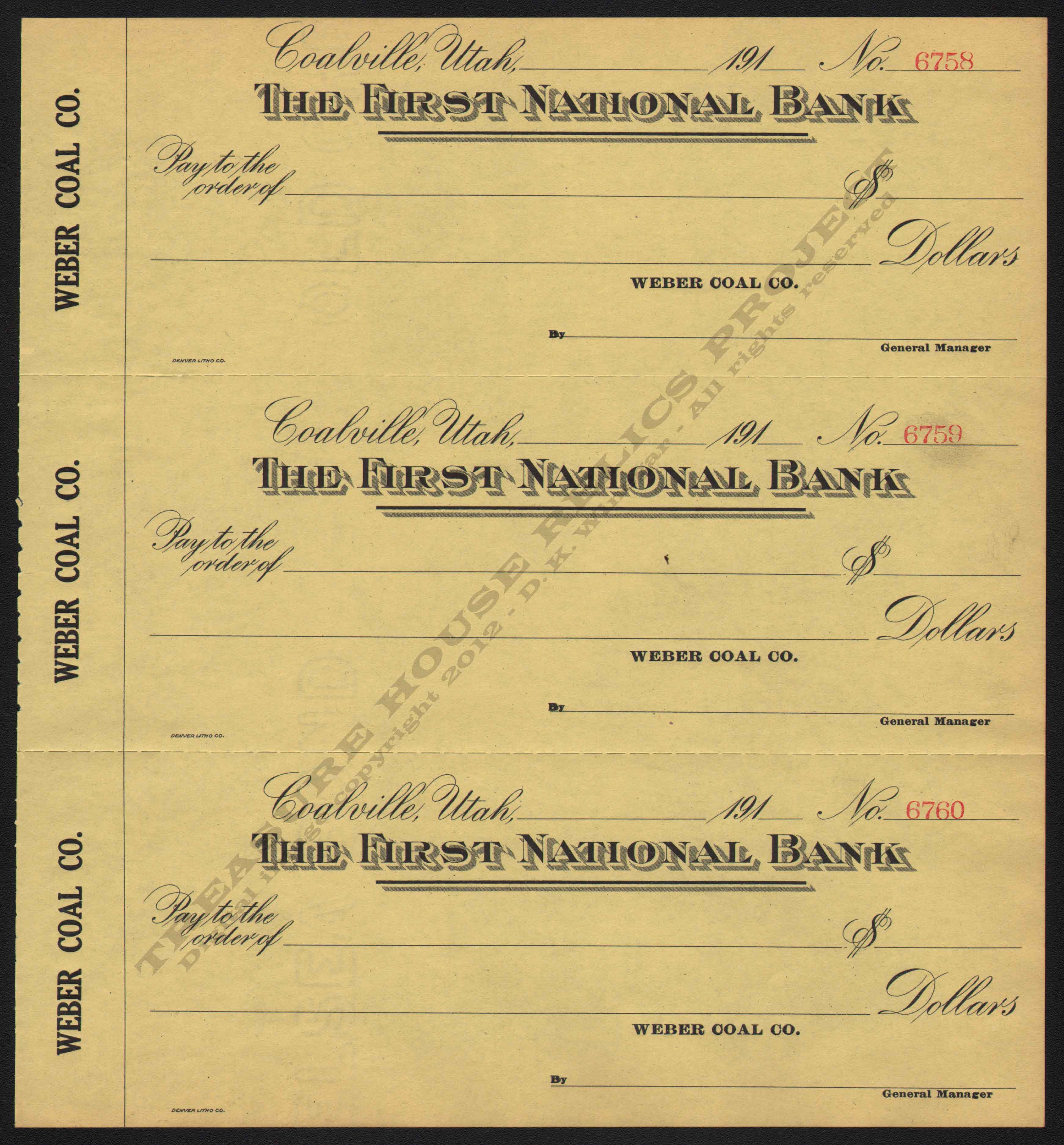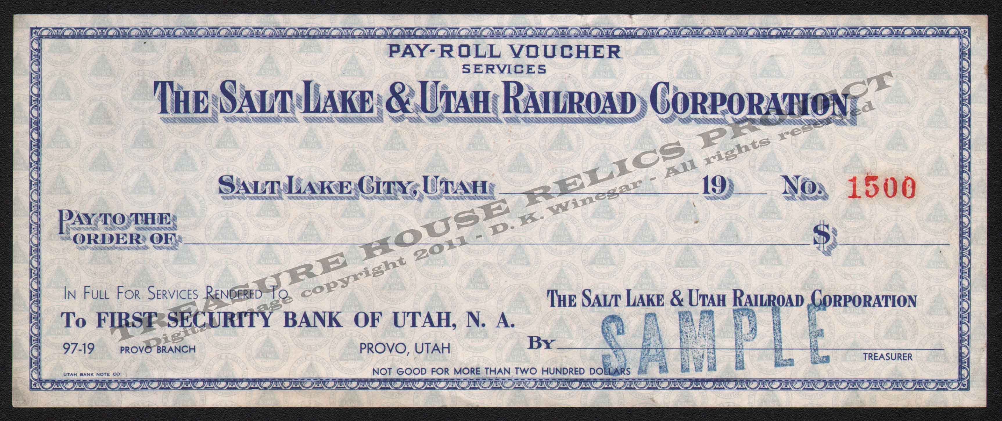 of Utah. These checks, issued and redeemed, are fine examples of script printing and security paper of the day. These checks