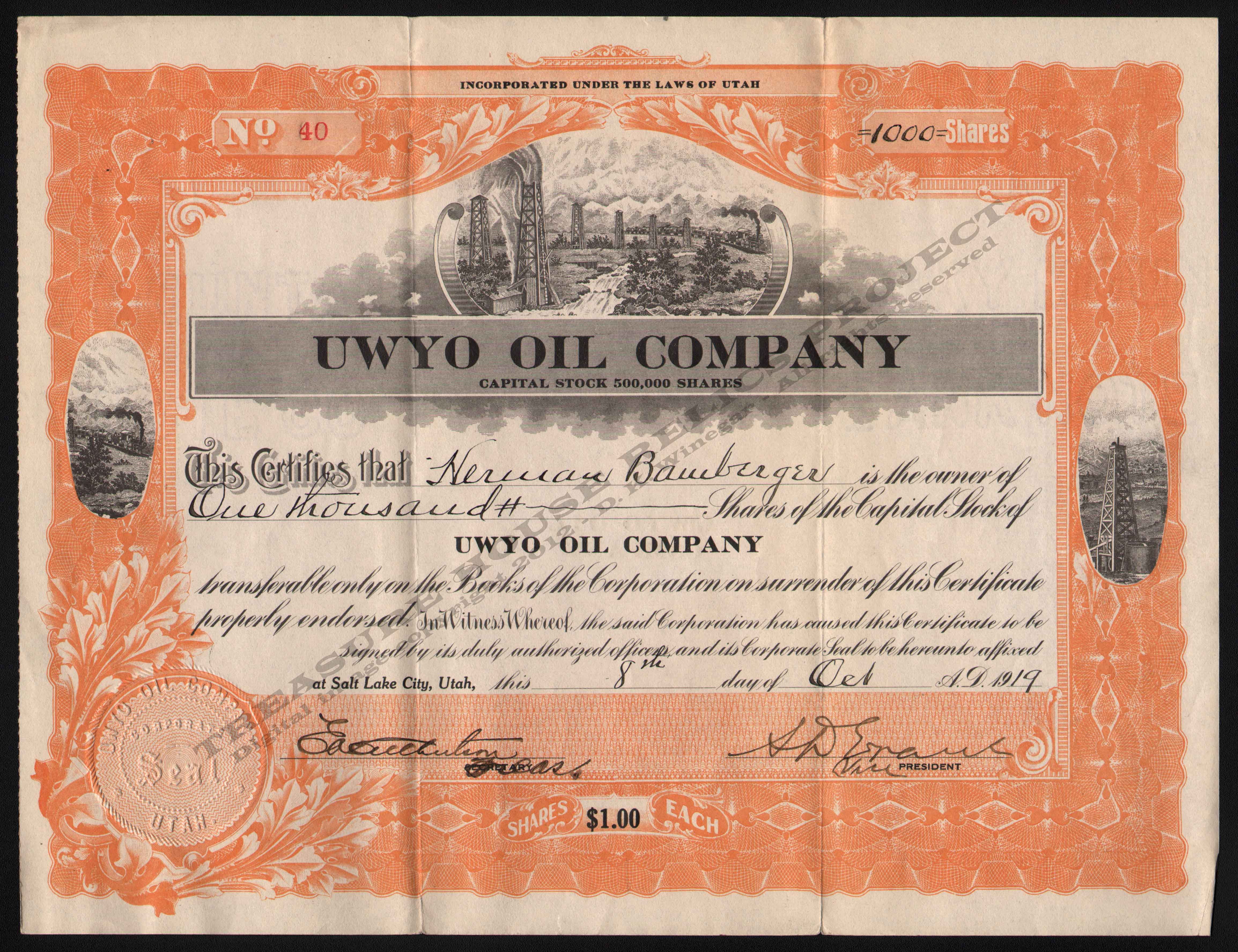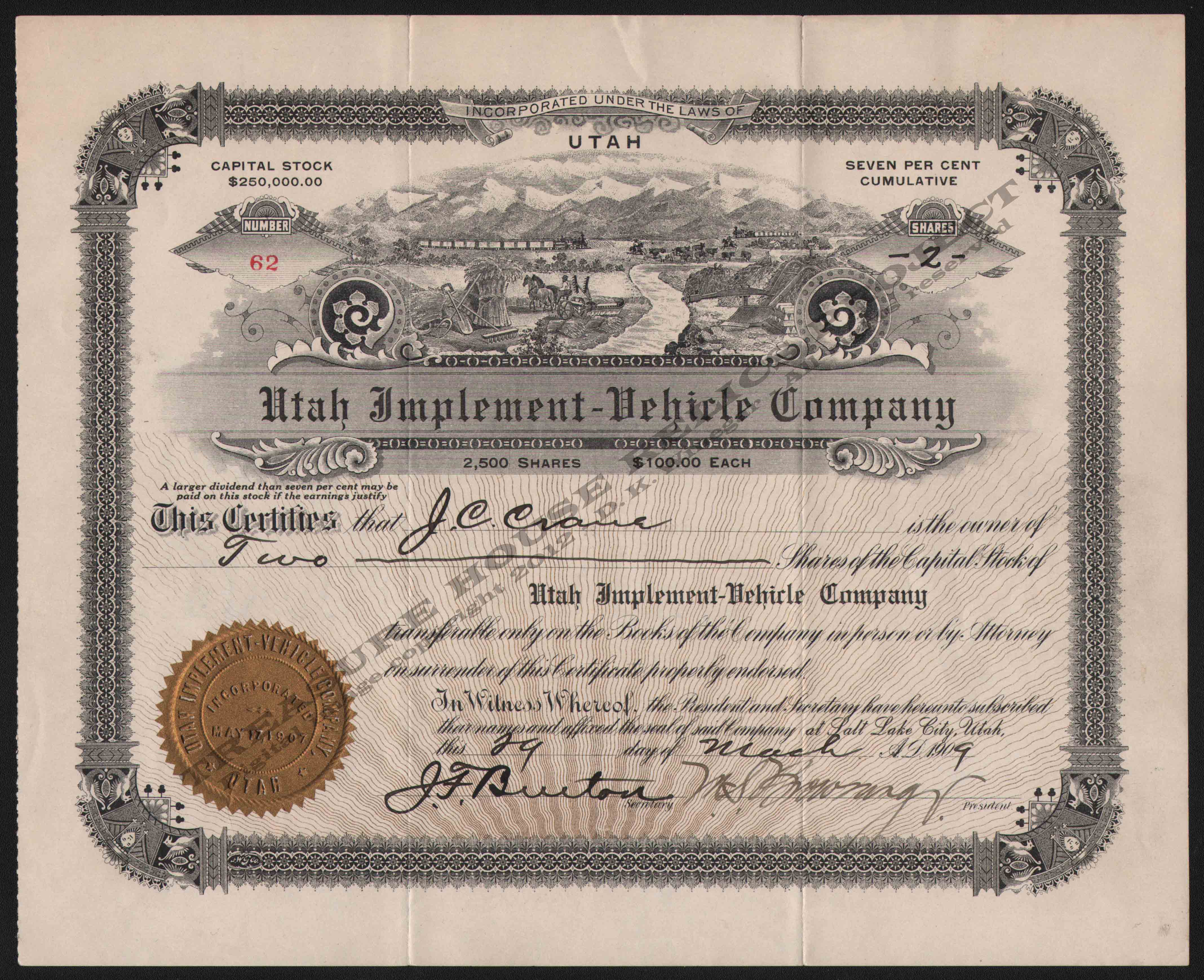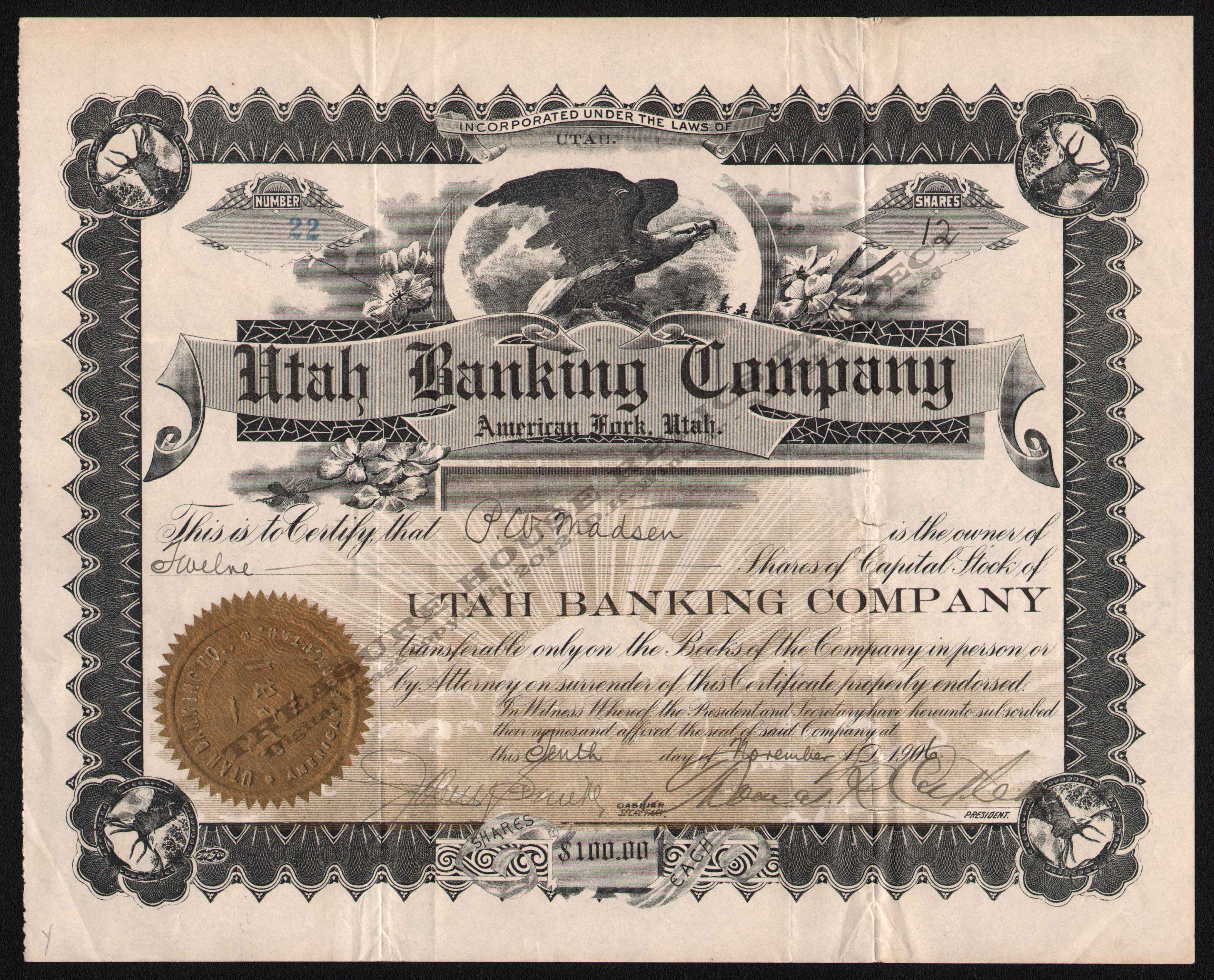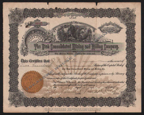 1891 Utah Book and Stationary Company stock certificate image provided courtesy David Beach, Rare Stock & Bond Dealer. View and purchase this certificate on