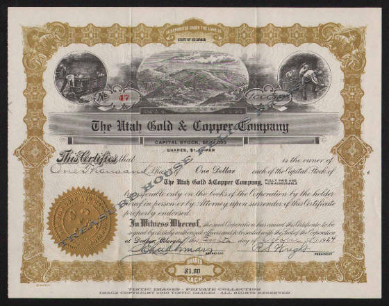 1905 Utah Development Company stock certificate image provided courtesy David Beach, Rare Stock & Bond Dealer. View and purchase this certificate on