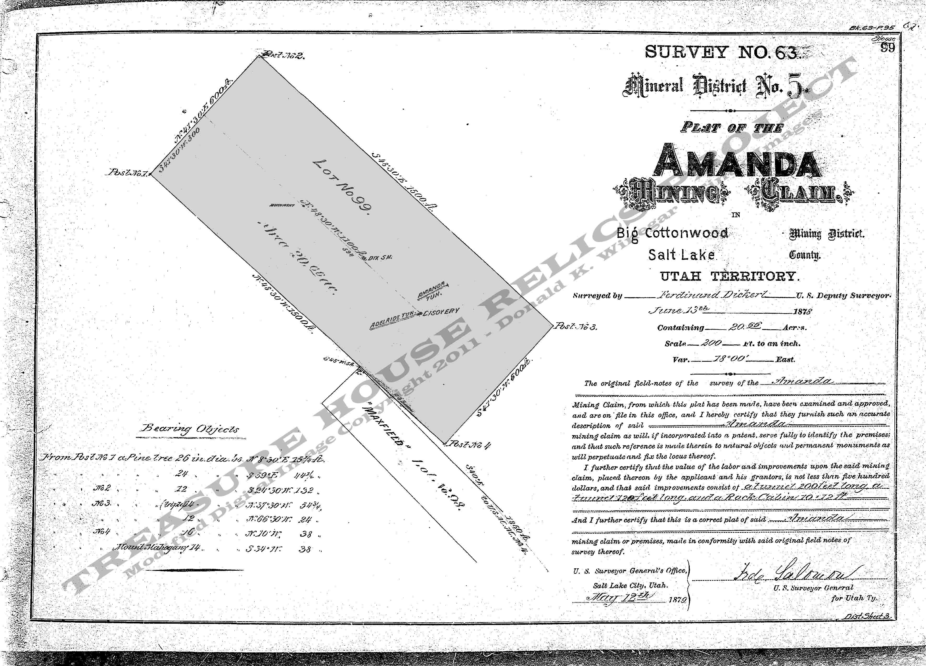 Claim, Big Cottonwood Mining District, Mineral District #5, Mineral Survey #63, Lot #99, dated June 13, 1878. The original